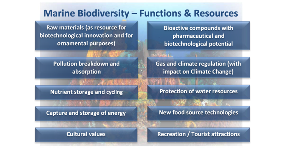One could argue that biodiversity has innate importance, as life has value on its own. Besides this consideration, marine ecosystems have several functions critically important to life on Earth in general and to human well-being in particular. Habitats such as mangroves are key to coastal protection against extreme flooding events. High marine biodiversity increases the resilience of marine ecosystems against climate change and ocean acidification. Marine resources were recently estimated to contribute 16.9% of the animal protein for nutrition worldwide (FAO, 2012). Marine biodiversity is essential to the provision of ‘ecosystem services’ such as: